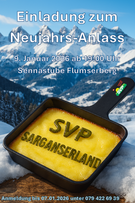 Die SVP Sarganserland lädt ihre Mitgliederinnen und Mitglieder zum Neujahrs-Anlass 2026 ein. Wir treffen uns am 9. Januar 2026, ab 19:00 Uhr in der Sennenstube Flumserberg zum gemeinsamen Raclette-Plausch. Die Teilnahme ist für SVP-Mitgliederinnen und Mitglieder der SVP Sarganserland kostenlos.