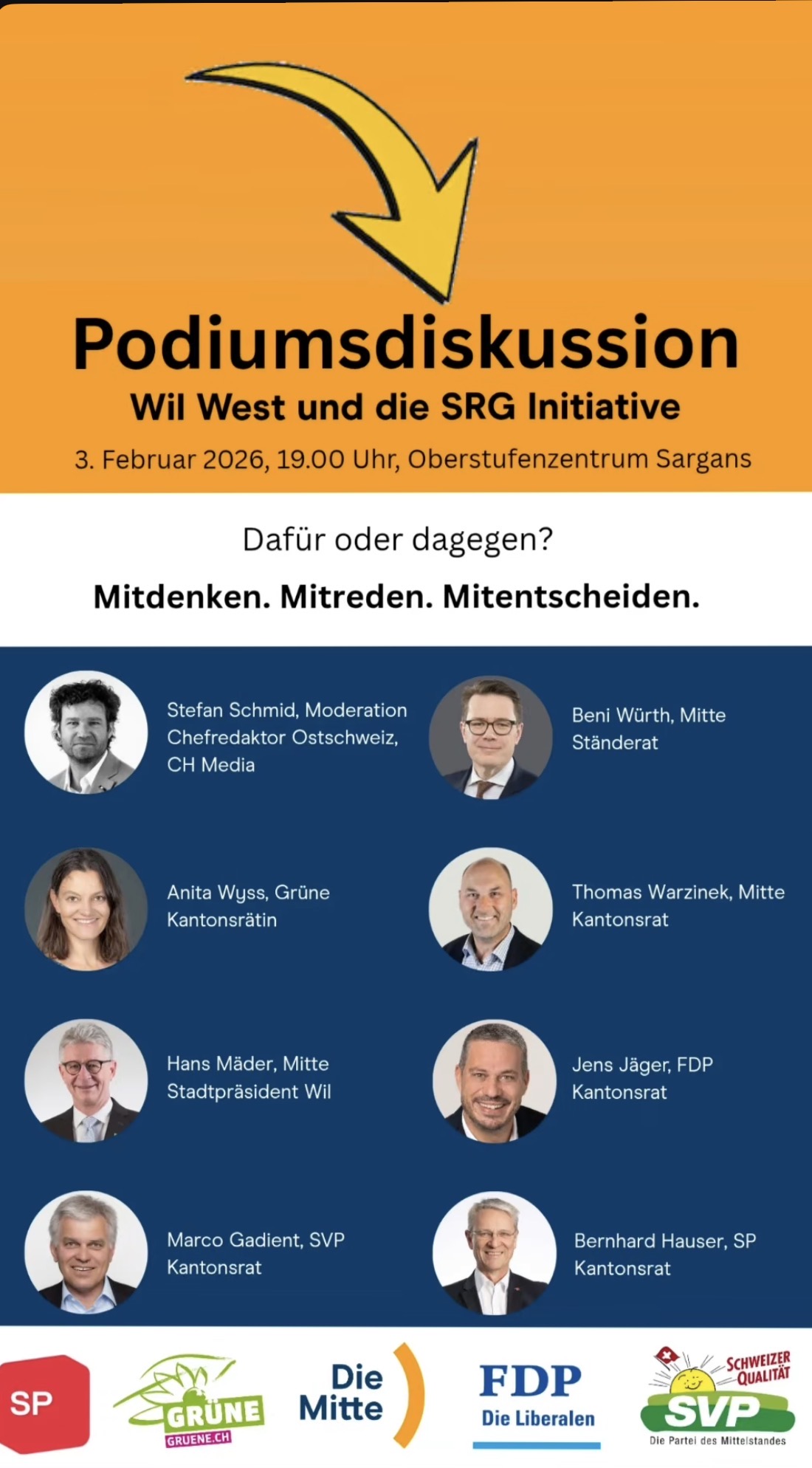 Am Dienstag, 3.Februar 2025 um 19:00 findet das Podium der sarganserländer Kreisparteien im Oberstufenzentrum Sargans statt. Themas: WIL West und die SRG Initiative.